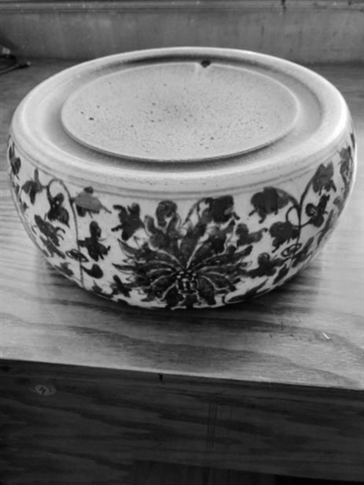 第二件,鼓形青花瓷暖砚。砚径28cm,高12cm。鼓身上釉,绘青花番莲缠枝纹饰。砚面无釉,砚堂微外高,上部开口一小圆孔,腹中空。砚底中心有口杯大小施釉双圈“大明年制"四字款识。砚底其他地方无釉,火石红色重面大。该砚青花发色好,沉稳庄重,光泽温润。使用痕迹明显,有岁月沧桑感。