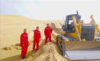 在岳奎明的带领下,人停车不停,机械设备连轴转,无论白天还是深夜,只要有抢险车辆、抢险物资进入沙漠便道,项目部的装载机和巡线值班车就一路护送至拐6井井场。