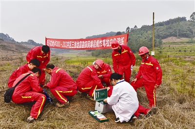 11月13日上午11点左右,川南泸州市海潮镇天全村,四川盆地泸201—202井区页岩气三维项目工地,中石油东方物探西南分公司民爆三队在测线的山地旷野中进行一场“惊心动魄”的模拟事故演练,拉开了物探施工项目野外事故立体应急救援模式。