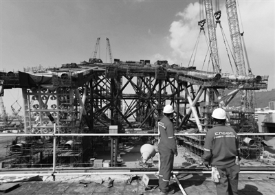 中海油南海东部陆丰14-4钻采平台导管架主结构日前成功合龙。陆丰14-4钻采平台导管架为八腿浮托结构导管架,总重超过1.5万吨,作业水深144.3米,标志着南海东部陆丰油田区域开发项目工程建设迈出关键一步。图为陆丰14-4平台导管架主结构合龙。