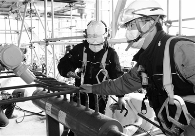 | 东区新建220吨燃气锅炉,图为工作人员正在对设备充水情况进行检查。孟立军 摄 |
