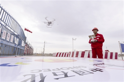 图为无人机飞行员蒲红斌正在巡井。无人机使管道巡检时间由4小时缩短至20分钟,单次管道刺漏污染面积下降62.92%。