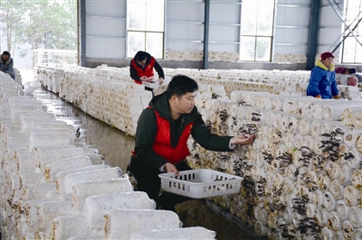 | 图为村干部在贵州省剑河县柳川镇关口村帮助群众采收食用菌。 |