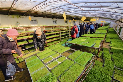 | 北京市农业农村局宣教中心组织60名市民代表参观芽苗菜生产基地感受冬天里的春天。图为市民参观待收获的芽苗菜。 |