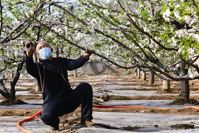 | 图为河北省石家庄市赞皇县土门乡龙堂院村的果农在花果山生态农业园区大棚内给樱桃花授粉。 |