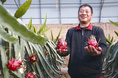 | 图为在甘肃敦煌市转渠口镇雷家墩村生态农业园区,农民在日光温室里展示种植的火龙果。 |