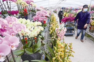 | 江苏省南通市通州区平潮镇国道村世阳生物蝴蝶兰生产基地智能温室大棚里一片繁忙,30多个品种60000株蝴蝶兰节前销售火爆。 |