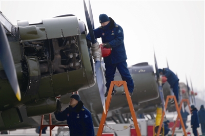 | 机务人员认真检查维护飞机,确保飞机不带任何故障上天。 余红春 摄 |
