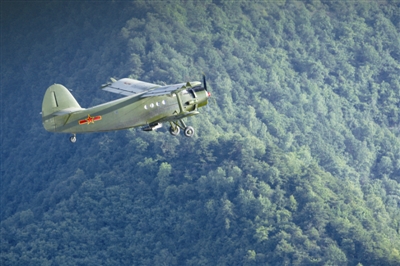 | 经过多年的飞播,西北地区生态环境得到极大地改善。图为运-5飞机飞越秦岭播区,察看飞播成果。(资料图片) |