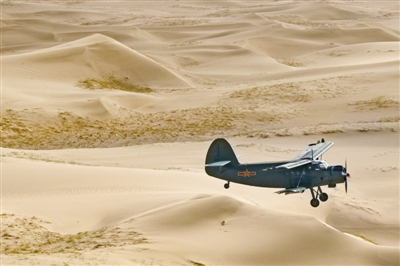 | 为了保证飞播质量,飞行员必须驾驶飞机保持离地50米的高度飞行,几乎是贴着地面在播种。图为2020年6月,该大队飞行员驾驶飞机在腾格里沙漠超低空飞播。刘畅 摄 |