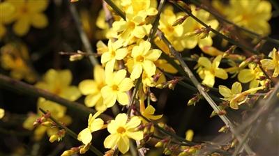迎春花枝、茎高高突起,看似平凡无奇,殊不知它们背后潜藏了巨大的爱心和能量。特别是春雨浸润,沿着浅绿到墨绿的枝条滴落,金黄的花瓣犹如静美音符跳动起来。迎春花绽放时,春天真的来了。从远处看,迎春花极密实,一大丛一大丛的,那金灿灿的仙云,如同一群长着羽翅的小天使在轻轻地飞。