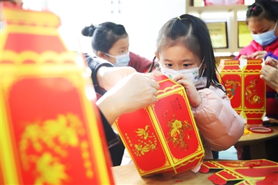图1:山东省青岛西海岸新区珠山路社区的小朋友在社区党群服务驿站做灯笼。图2:就地过年的藏族学生在庆元宵活动上猜灯谜。