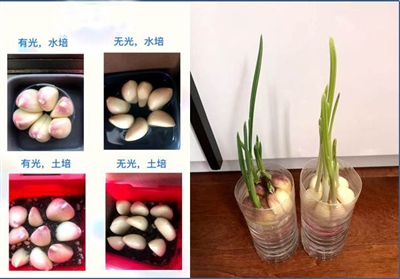 第二步,按光照进行分组。把一份水培和一份土培大蒜,作为有光照实验组;把另一份作为无光照实验组。