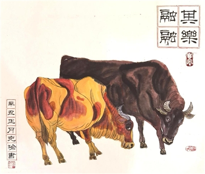 我和夫人都属牛,今年都是本命年。辛丑春节期间,邻居好友金克瑜先生画《其乐融融》双牛图相赠。凝神赏画,见两牛相互依偎陪伴,互为照应关爱,令人感动。有感于斯,填《沁园春》词一首,以表情怀,以作答谢。“旭日初升,薄雾朦云,旷野踏青。沐春风阵阵,荡胸涤肺,欢蹄轻快,相视哞鸣。孺子呆萌,老牛慈爱,最是无私舐犊情。尤欣慰,观款踱信步,其乐融盈。//年华交替更频,循天道,又迎辛丑临。叹多舛庚子,新冠病疫,猖獗寰宇,鼠窜难宁。世界同村,普天同运,万物苍生连一心。莫争斗,献和谐词画,共享丰赢。”