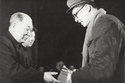 | 1981年,中国科学院研究生院首届研究生毕业典礼上,严济慈为学生颁发毕业证书。 |