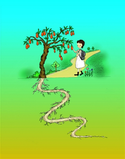 为了让枸杞树茁壮成长,根不惜将自己的身体扭曲,为的是探到更深的地下,寻找更多的养料与水源。为了让树多多结果,根努力让自己向前、向前、勇往直前……