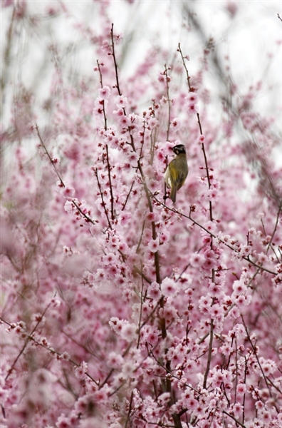 图1:江苏南京梅花山,一只小鸟在美人梅枝头栖息。