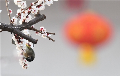 图2:山东省滕州市公园,小鸟在花枝上觅食。