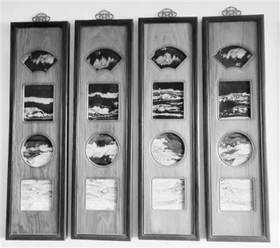这组云石挂屏共四扇。每扇长92厘米、宽25厘米。红木画框,云石片镶嵌在有扇面、四方、浑圆、正方四种形态开窗里。12块云石板片地底子黝黑,花纹团金晕红,似夜晚追月的彩云;四块云石板片五彩交混,如白日腾涌的江河流水。画面自然清新,赏心悦目。