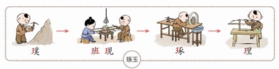带“王”的字,很多都和玉器有关。除了“班”以外,我们常说的“琢”也属于玉器加工的范畴。“玉不琢,不成器”,意思就是玉不经过雕琢,就不能成为玉器。《诗·卫风·淇奥》:“有匪君子,如切如磋,如琢如磨。” 切、磋、琢、磨,分别是加工骨头、象牙、玉器、石头,经过切磋琢磨之后,这些原始材料才能成为精美的“器”。由此产生了两个词——“切磋”“琢磨”。现在,人们经常用“切磋”比喻两个人在道德学问方面相互研讨勉励,用“琢磨”来比喻思考的过程。
