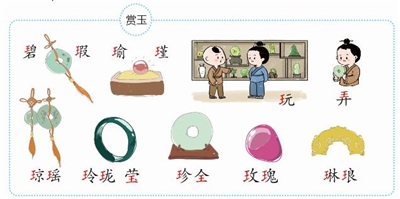 玉经过加工以后,就成了玉器,比如玉环、玉珠、玉璧、玉璋等。它们的品质不同,有的很完美,有的有“瑕”。人们用两只手拿着玉把玩,这个叫“弄”。“玩”和“弄”的本义都和欣赏玉石有关。