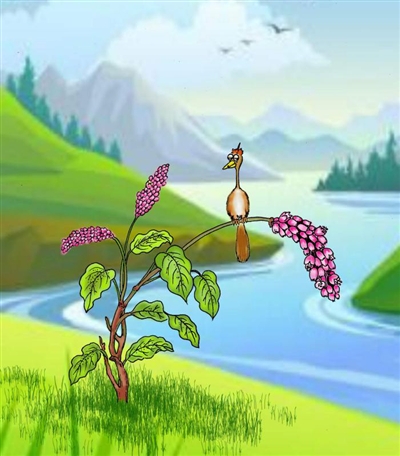 隔了这么多年,我依然可以清晰地记得那幅画面。通体赭石色的背景,一只褐色的水鸟站在被压弯了腰的红蓼枝条上,窥视着水里的鱼虾,伺机而动。红蓼上点点盛开的粉红色花朵,是画面上仅有的亮色。