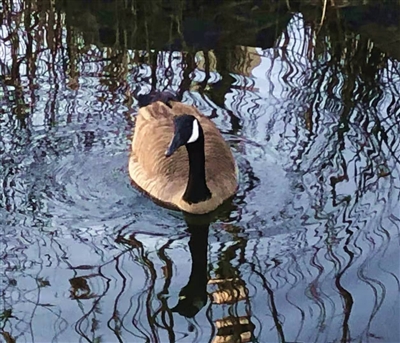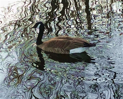 4月6日傍晚,笔者在加拿大蒙特利尔市圣劳伦区的住所小区漫步。路过人工湖,发现几只鹅正在悠闲地游水。鹅前进运动形成的涟漪水面,将岸边树枝和芦苇的倒影折射成柔曲抽象的图案,让人看到了一种生态和谐的自然美,从变化的大自然中感悟生命的美好。