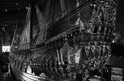初见古老战船的刹那,还是很令人震撼的。船头高昂,通体华丽耀眼,威武的雄狮立于船首,跃跃欲扑,永远保持着战斗的姿态。在17世纪,瑞典人喜欢将狮子作为装饰物,国王Gustv Adolf二世当时亦以“北欧雄狮”著称。船首两侧分别雕刻着20个列队而立的罗马皇帝——他们是瑞典君主引以为豪的先驱。