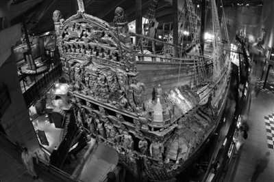 “瓦萨号”装备有64门大炮,以瑞典Vasa王朝(1523-1654)创建者Gustavus Vasa的姓氏命名,船体总长69米、宽11.7米、总排水量1210吨,属于当时最先进的风帆战舰之列。虽然仅航行10多分钟就沉没了,但它还是将逝去年代里瑞典人的造船技术与工艺,以实物见证的方式留存下来。