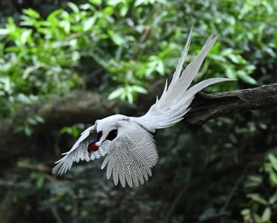 白鹇,鸟纲,鸡形目,稚科,鹇属,雌雄羽色相异,外形条件极好,犹以雄鸟更为出众。雄鸟长约100-119厘米,头上羽冠及下体呈蓝黑色,脸裸露,赤红色,中央尾羽纯白,背及其余尾羽白色带“V型”密纹,尾长而白。由于体型较大,全身白色占比较多,看起来银装素裹,分外妖娆。当雄鸟悠闲地在林间站立时,体态举止优雅,如同一位白衣仙人看尽千帆,遗世独立。雌鸟的容颜相对雄鸟较为逊色,身长约58-67厘米,暗色羽冠,脸裸出部小,赤红色,上体橄榄褐色至栗色,下体具褐色细纹或杂白色或皮黄色。