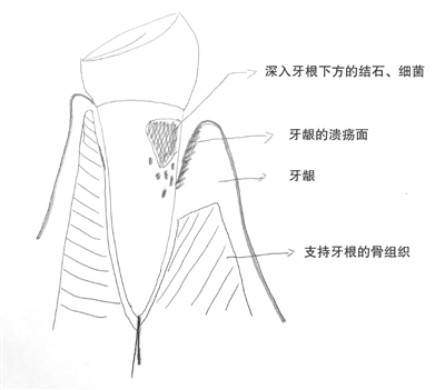 牙周发炎时,细菌将牙龈从牙根表面分离,形成牙周袋,约200种细菌在牙周袋内繁殖并且钙化,在牙龈下方形成牙结石。牙龈就这样24小时紧贴着细菌、牙结石,朝向牙根的表面会出现细小的溃疡。中度牙周炎患者牙龈的溃疡面加起来能够达到20平方厘米,相当于成年人手掌的面积。这些溃疡面也敞开了一扇大门,使得细菌、细菌毒素和炎症产物能够进入身体的血液循环和神经组织,穿透血脑屏障,进而影响大脑组织。