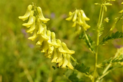 在草本植物里,黄芪花的身姿实在很是特别,棕黄色主枝直立向上,秀美干爽。清朗的嫩绿花托、骄傲的金黄花瓣,看一眼就不会忘记。五六月间,在华北、西北、内蒙古、东北的山坡上处处可见。这种高大的草本植物,既不魁梧也不臃肿。小小的叶片排队般整齐地站在细细的枝条上,叶片两面都有白白的细茸毛,像羽毛那般飘逸。一串串金黄的花骨朵挂在叶旁,花瓣大而低垂,真有点儿像古代王孙公子的金色环佩。微风吹来,羽臂轻摇,倜傥风流。