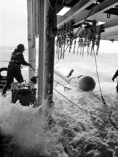 5月5日,中海油服物探事业部“滨海517”船队,在涠西南进行海底电缆地震采集作业。震源组长邓永进利用牵引绳减少大风浪造成枪阵浮体大头的摆动,避免浮体大头碰撞损坏,保障震源设备安全。周艺 摄