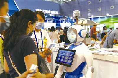 | 图为参观者正在与具有”丰富农业知识”的机器人交流。 |