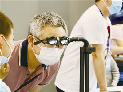 | 图为一位老人正在体验Nreal公司自主研发的混合现实眼镜。 |