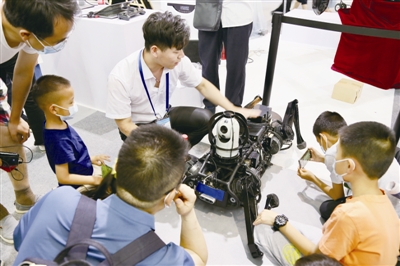 | 科技周上展示的50kg电驱动四足仿生机器人吸引了很多人的目光,图为工作人员在为小朋友们讲解并进行演示。 |