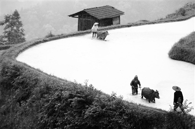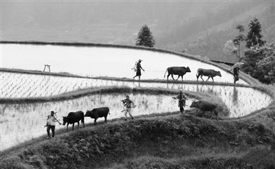 5月23日,贵州省黔东南苗族侗族自治州黎平县尚重镇上洋、下洋、岑埂等村的农民牵着耕牛来到岑丈梯田,参加“千牛同耕”活动,向游客展示当地传统农耕文化。 新华社发(方鹏 摄)