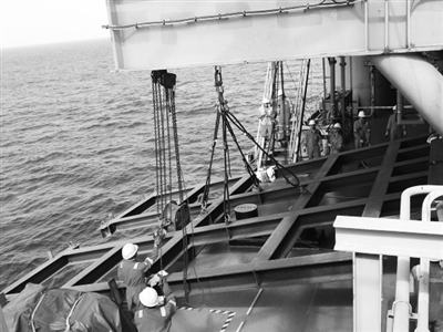潜水架底座长9米、宽7米,重6.8吨,吊装难度大,现场人员谨慎操作,密切配合,确保潜水系统底座安全就位。吴晨 摄