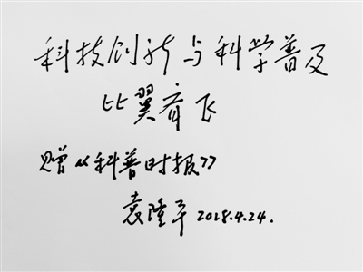 我请袁老为《科普时报》写几个字,他欣然应允,随即离开沙发,来到旁屋麻将桌前,一板一眼写道:科技创新与科学普及比翼齐飞,赠《科普时报》,并签上名。