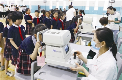 | 西安,眼科专家们对学生进行视力筛查,为家长提供现场咨询义诊。 |
