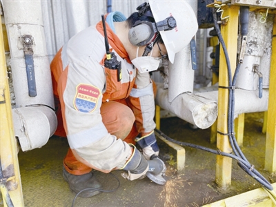 图为锦州9-3油田一名员工对橇块进行除锈作业。