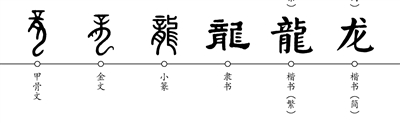 再来说说“龙”字,其甲骨文和金文都像是一条龙,大口、长身,头上有角。龙是综合了九种动物的形状和特征加以想象而成,也就是“龙有九似”。