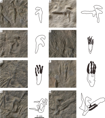 | 乌尔禾翼龙足迹(新种)正型、副型和重叠足迹(A前足正型;B-C前足副型;D-E后足副型;F后足正型;G-H重叠足迹) (图片由中国科学院古脊椎动物与古人类研究所提供) |