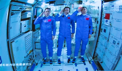 右图为在北京航天飞行控制中心拍摄的进驻天和核心舱的航天员向全国人民敬礼致意的画面。