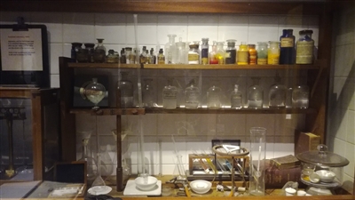 历史展区讲述了化工产业从诞生到现代化的故事。古埃及、古希腊、古中国、古印度等很早就开始了涂料染料制作、火药制备、青铜器浇筑等初步化工实践,但直到19世纪初才开始形成现代化学工业。展区通过画像、信件、产品获奖证书、肥皂、化学实验室设备(图2)和高压操作间设备等真实展品,讲述了英国柴郡地区现代化学工业的发展历程。展区中还展示了19世纪初制碱工人使用的生产工具,有四五米长、几十公斤重,再现了产业工人工作的辛苦和产业新兴起时的状况。中心通过这些真实、富有历史感的展品,增进了公众对于化学工业历史的了解。