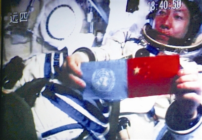 | 2003年10月15日18时40分,中国培养的第一位航天员杨利伟从太空向世界各国人民问好,并在舱内并列展示了五星红旗和联合国旗 |