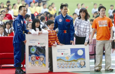 | 2005年11月27日下午,香港特区政府在香港大球场举行“全港欢迎神六载人航天飞行访港代表团大汇演”,欢迎两位航天员和航天飞行访港代表团全团成员。费俊龙(左一)和聂海胜接受香港青少年赠送的礼物。 |