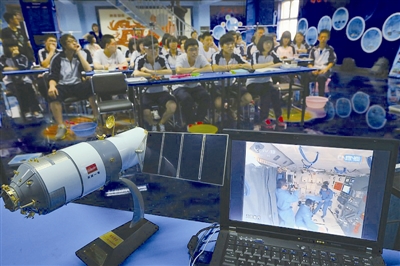 | 2013年6月20日,北京航天中学航天科技工作室“问天阁”内,物理教师温鹏正带着他们 “神箭班”的26名同学与天宫一号航天员王亚平同步进行着地面重力条件下和太空微重力条件下对比试验。 |