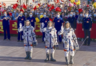 | 2021年6月17日,酒泉卫星发射中心问天阁广场,中国载人航天工程总指挥、空间站阶段飞行任务总指挥部总指挥长李尚福下达命令,聂海胜、刘伯明、汤洪波3名航天员领命出征,开启为期3个月的飞行任务,成为中国载人航天进入空间站阶段后的首批太空访客。 |