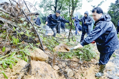 | 江西省德兴市香屯街道办党员干部正在疏通因山体滑坡致使受阻的道路。 |